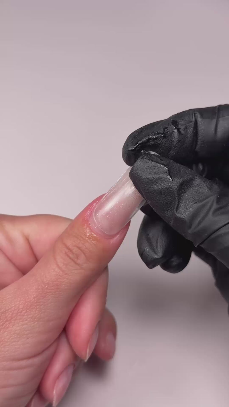 Limez légèrement la couche brillante du polygel. Il n’est pas nécessaire de limer en profondeur — seulement le scellant supérieur, afin que le dissolvant puisse bien pénétrer.
